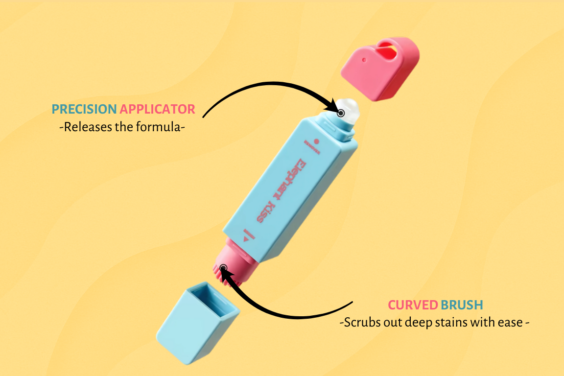 One tip dispenses just the right amount of cleaning formula. The other? A built-in scrubber that tackles the stain head-on. Two simple steps, one perfect fix , anytime, anywhere.
